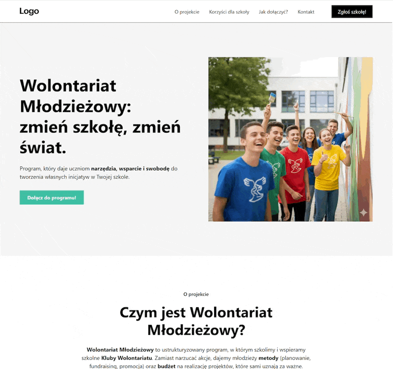Edytowanie tekstu w nagłówku i sekcji programu „Wolontariat Młodzieżowy”. W Webflow możesz dowolnie zmieniać treści, kolory i styl elementów, co pozwala w pełni dostosować stronę internetową do potrzeb projektu i zachowań użytkowników.