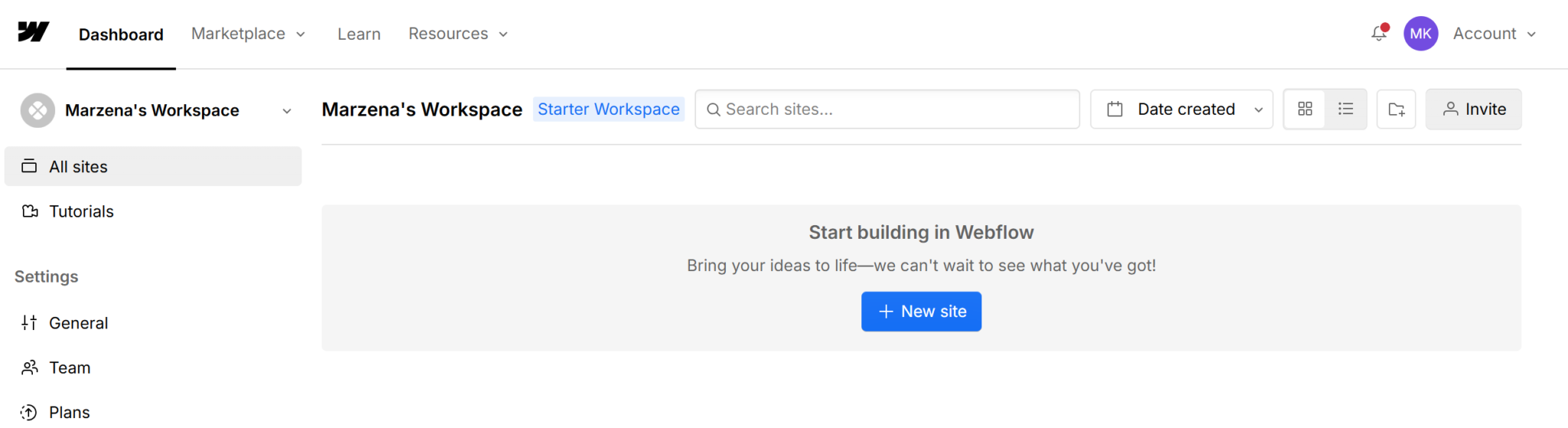 Panel startowy Webflow po zalogowaniu. To miejsce, w którym rozpoczynasz tworzenie strony internetowej. Kliknięcie przycisku „New site” uruchamia proces stworzenia strony w systemie no-code.