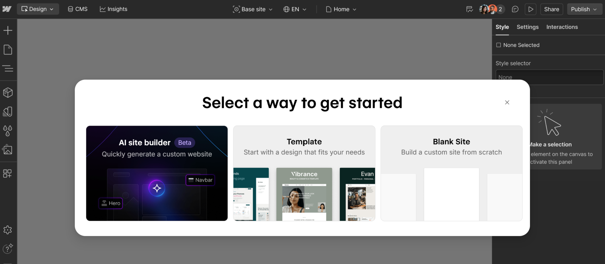 Ekran wyboru sposobu rozpoczęcia projektu. Webflow oferuje trzy opcje: AI Site Builder, gotowy Template lub Blank Site, pozwalający budować strony od podstaw. Dzięki temu każdy może wybrać styl tworzenia strony, który najlepiej odpowiada jego potrzebom.
