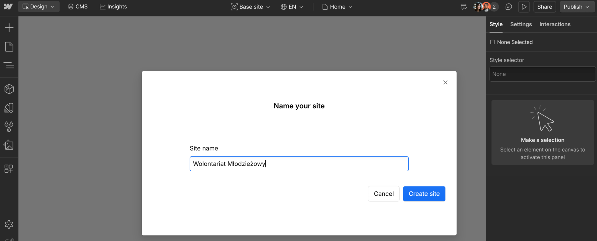 Wpisz nazwę swojej strony i kliknij przycisk „Create site”.