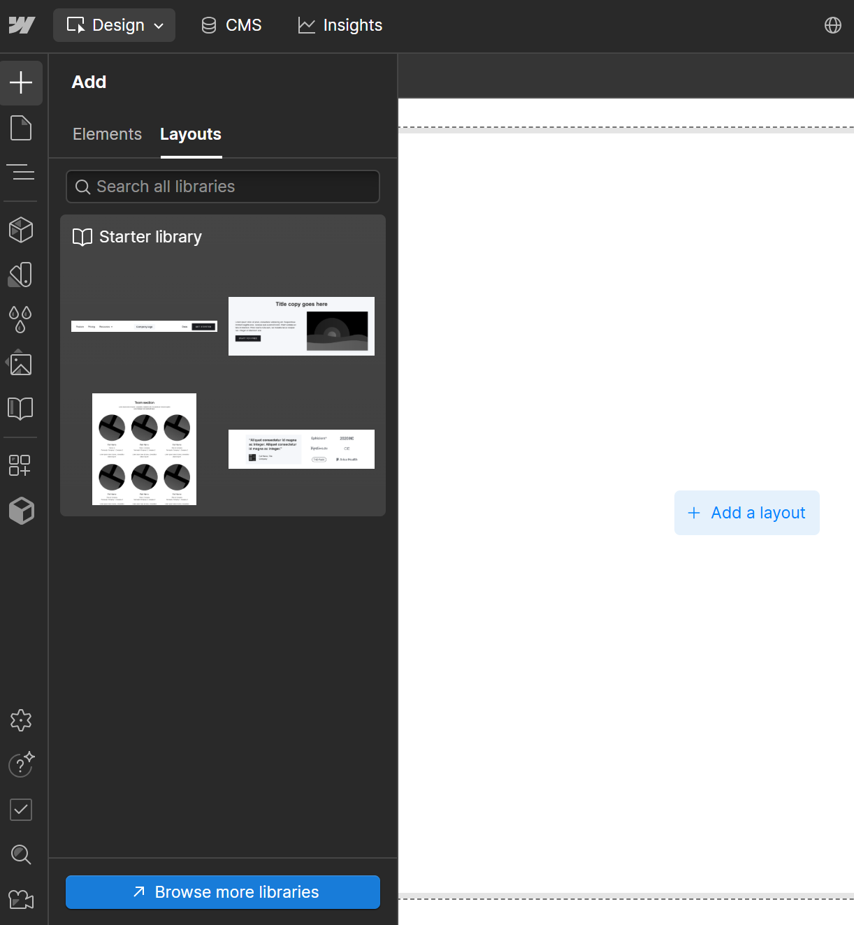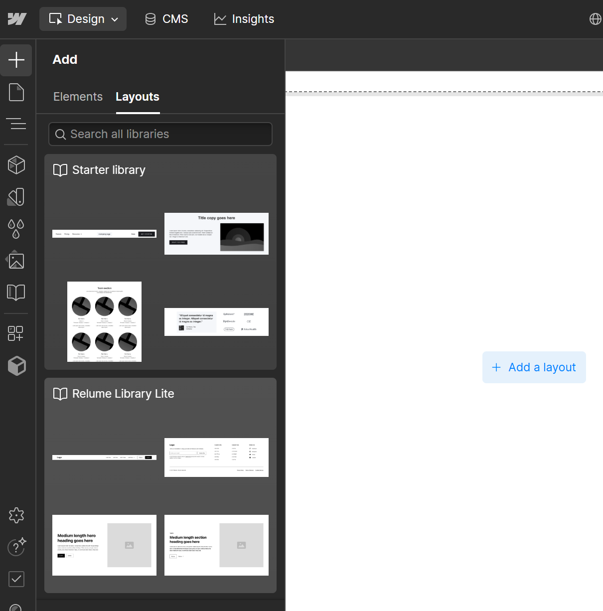 Panel boczny Webflow z zakładką Layouts. W tym miejscu można dodawać gotowe sekcje, korzystając z bibliotek komponentów.