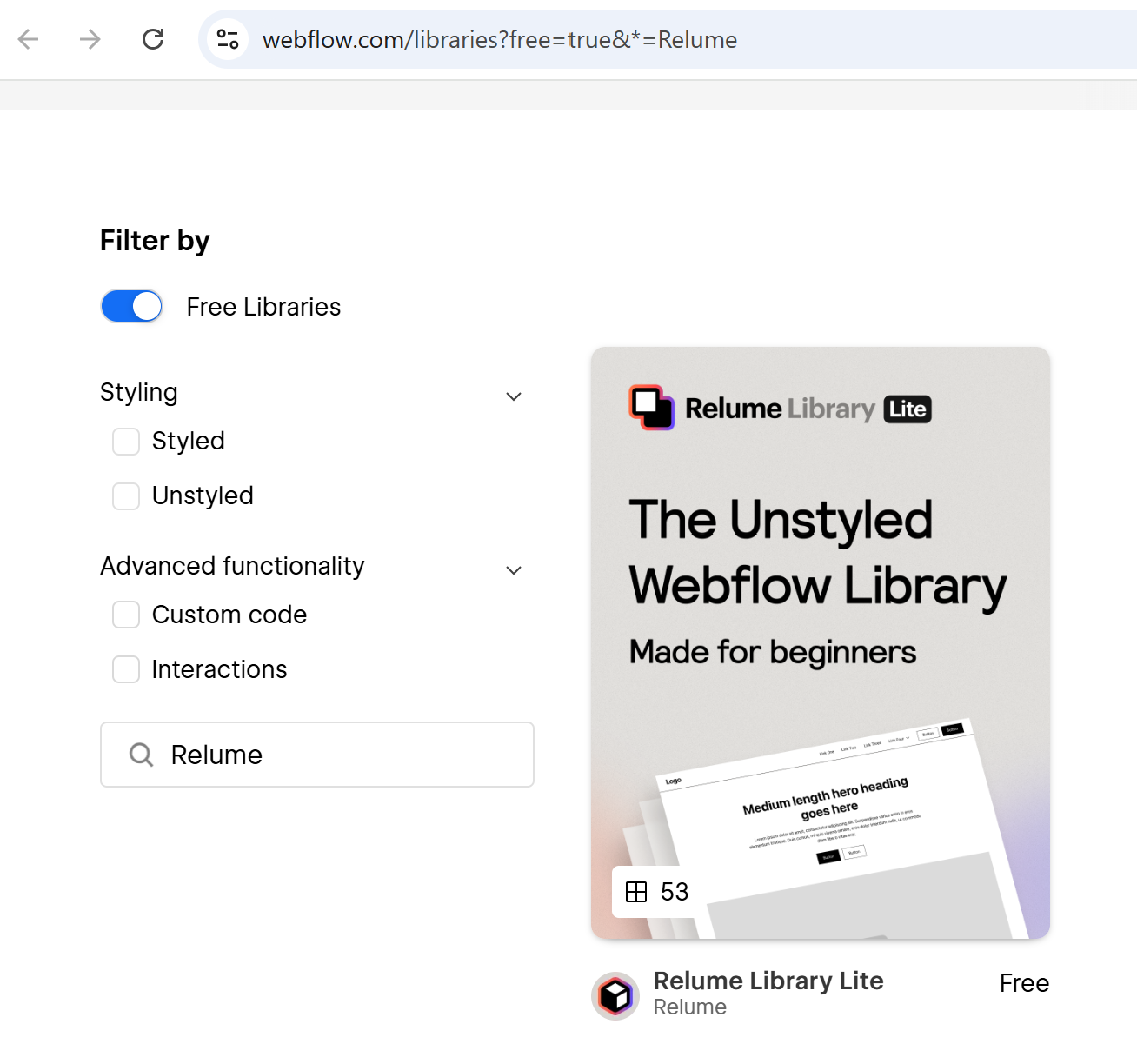 Zostaniesz przeniesiony/przeniesiona na stronę tzw. Webflow Marketplace. W znajdującej się tam wyszukiwarce zaznacz opcję „Free Libraries” i wyszukuj nazwę „Relume”.