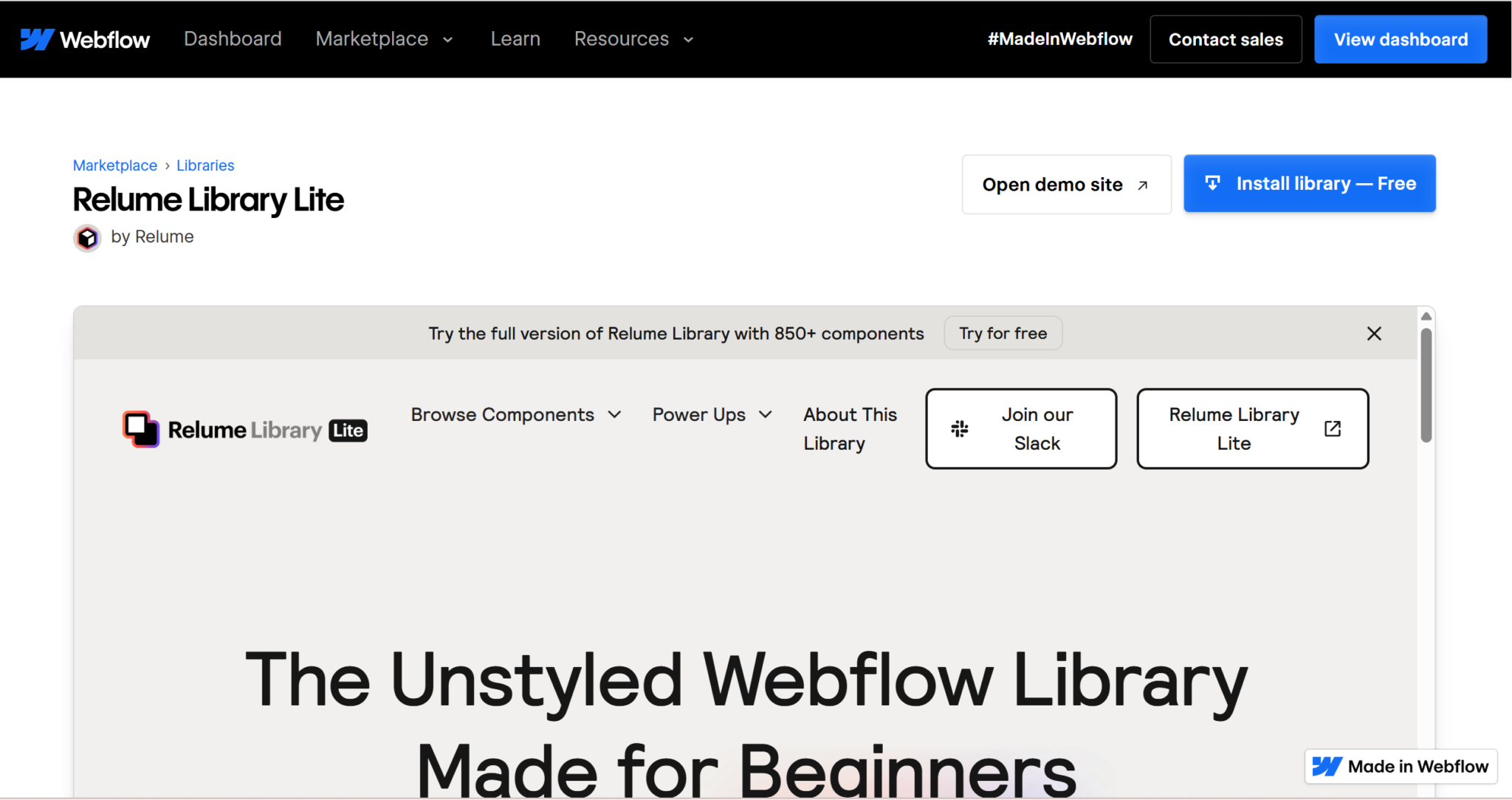 Widok strony Relume Library Lite w Webflow Marketplace. To darmowa biblioteka elementów, która wspiera tworzenie stron internetowych z gotowych komponentów. Świetna opcja dla osób, które chcą zaprojektować responsywną stronę internetową bez kodowania.