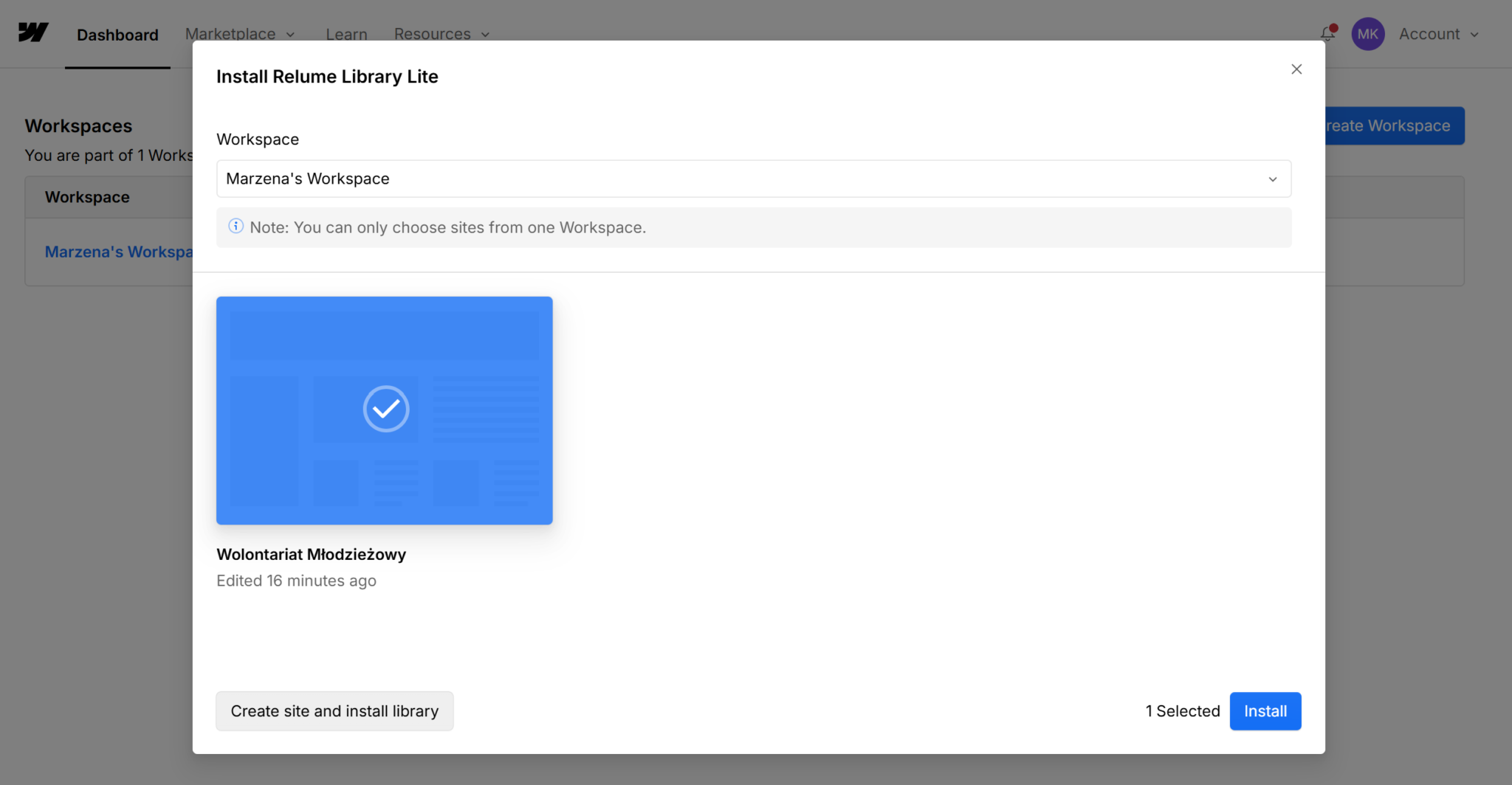 Ekran instalacji biblioteki Relume. Wybierasz przestrzeń roboczą (Workspace), w której chcesz dodać komponenty.