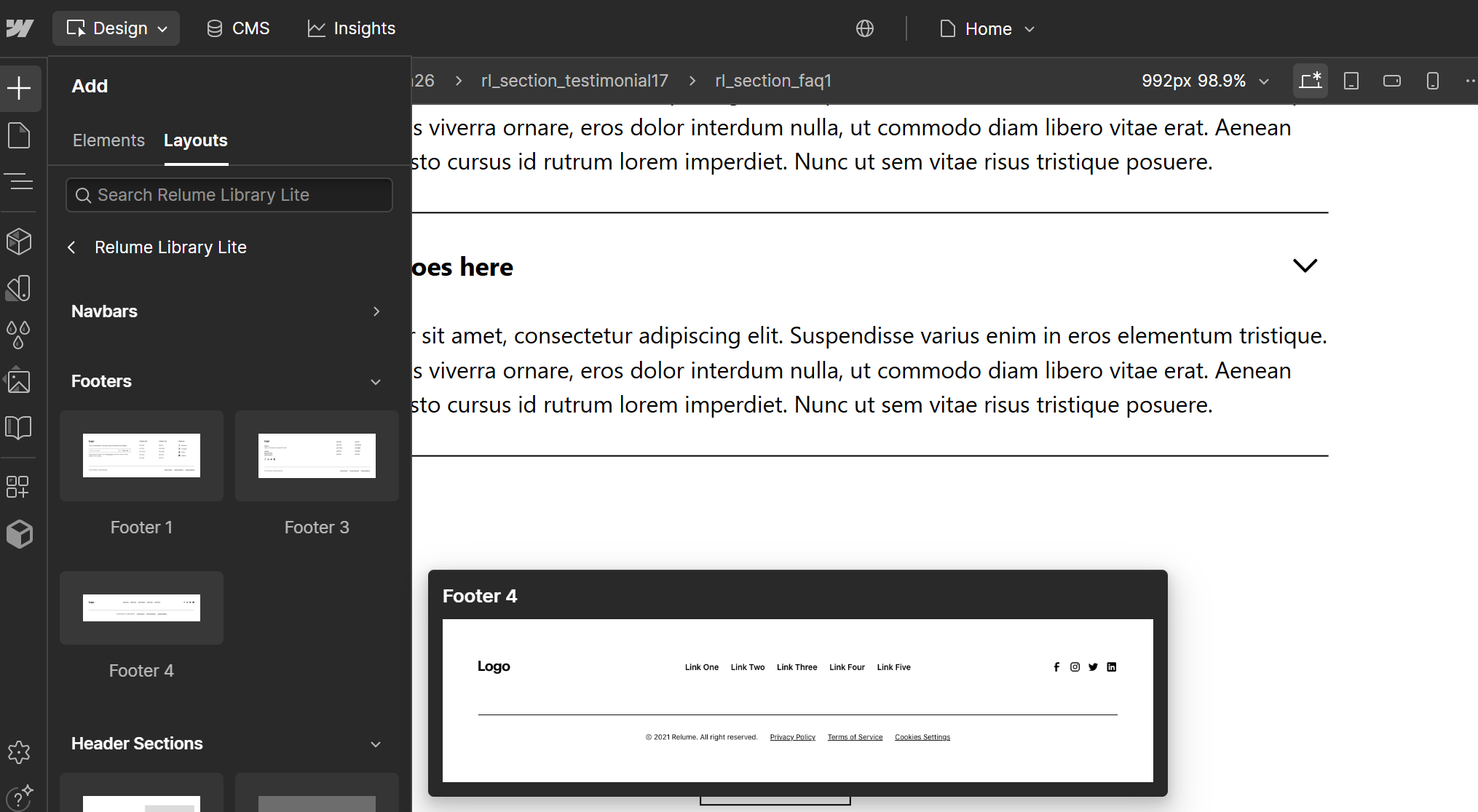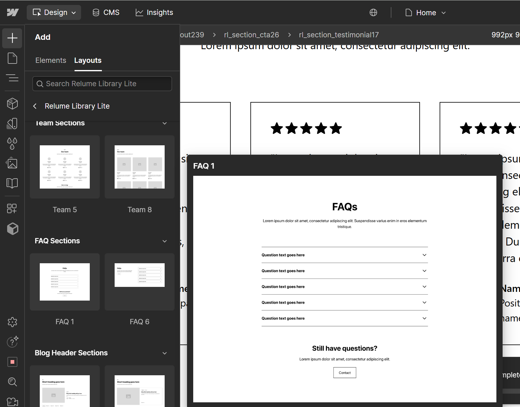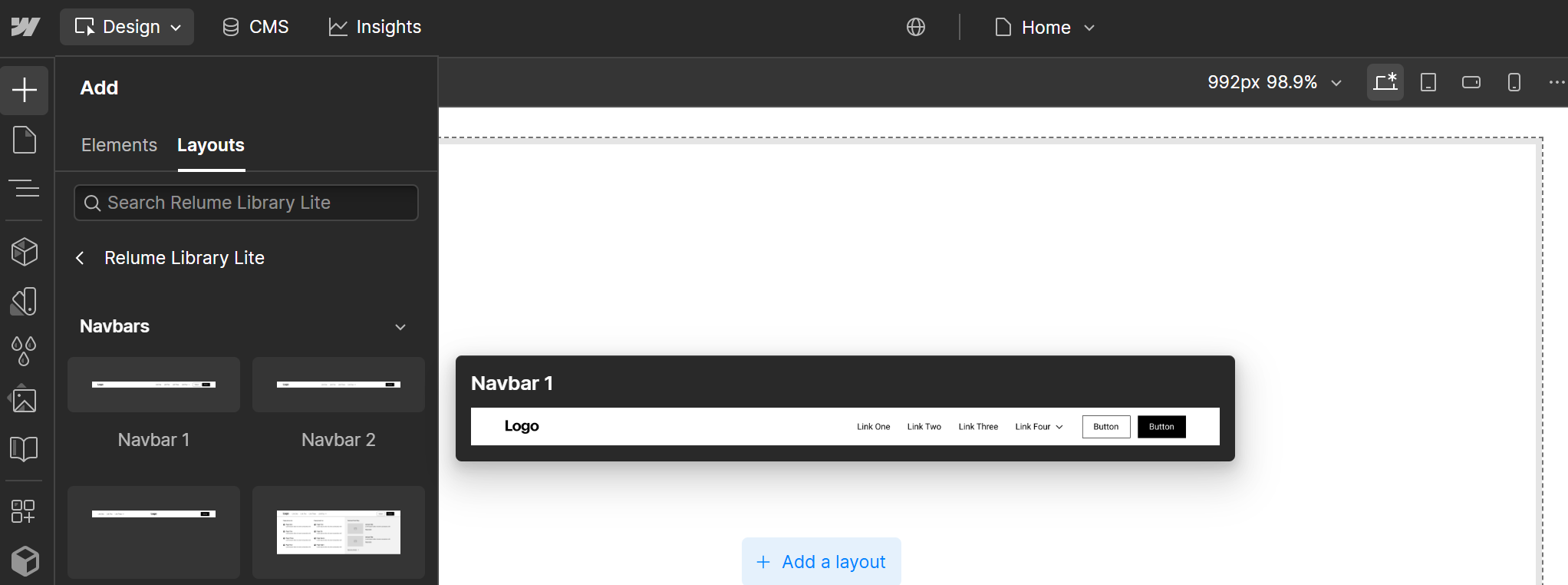 Biblioteka dodana! Teraz po ponownym wejściu do edytora strony i po kliknięciu „+” (Add Elements) w menu po lewej stronie. W zakładce Layouts będą już widoczne komponenty z biblioteki Relume Library Lite