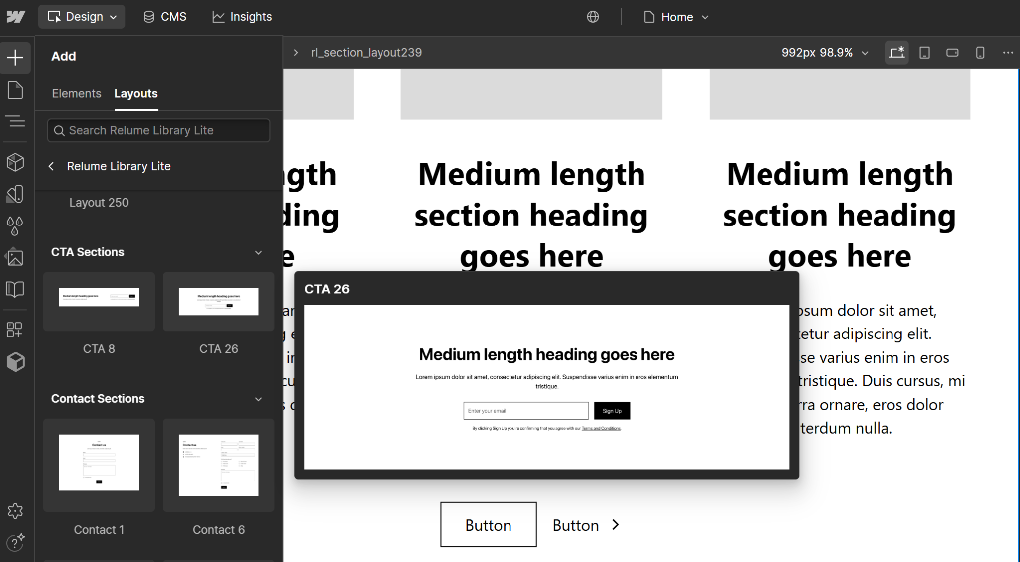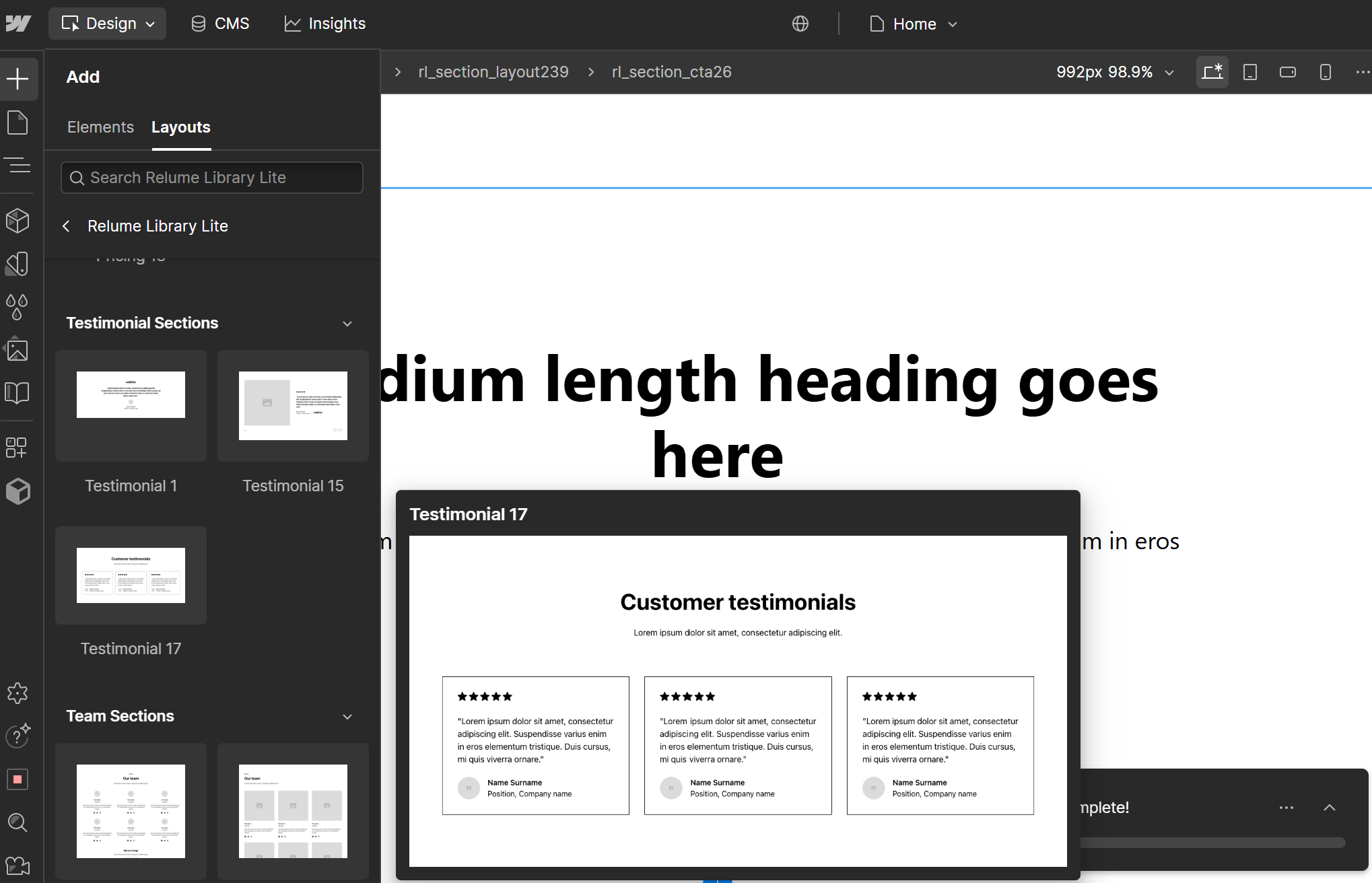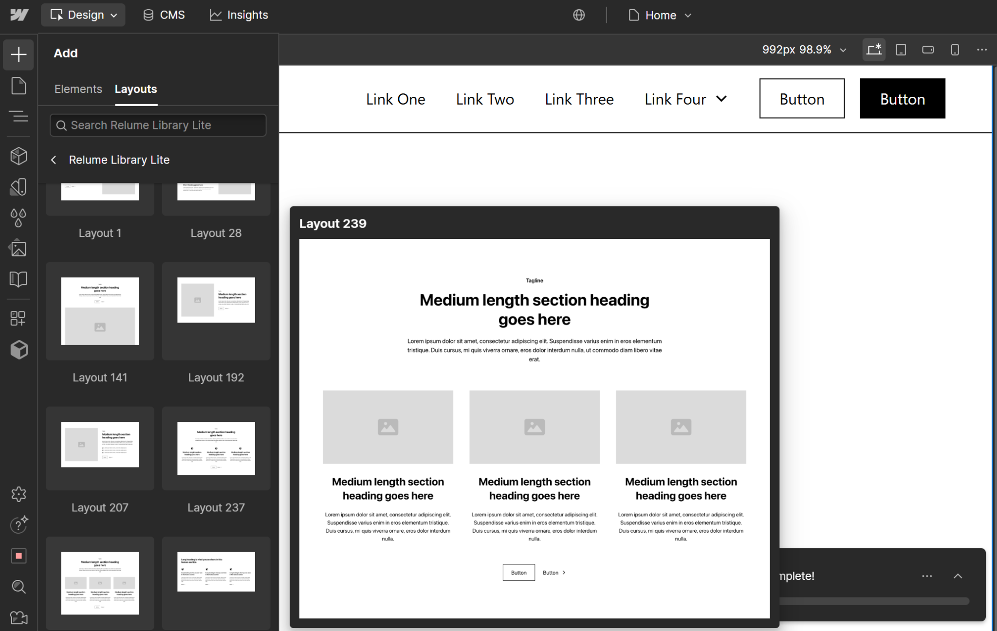 Biblioteka dodana! Teraz po ponownym wejściu do edytora strony i po kliknięciu „+” (Add Elements) w menu po lewej stronie. W zakładce Layouts będą już widoczne komponenty z biblioteki Relume Library Lite