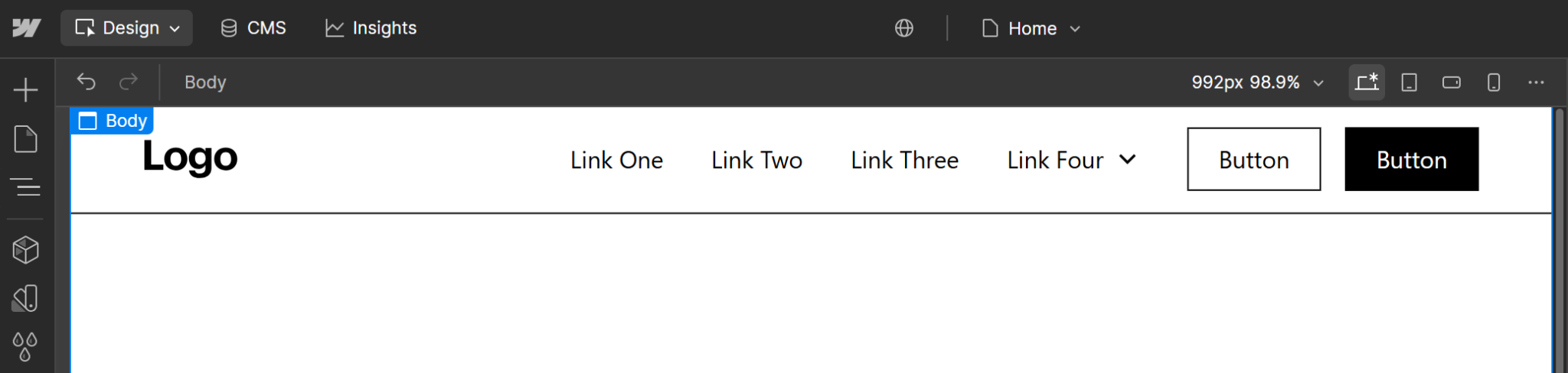 Webflow wygeneruje tzw. canvas – wirtualne „płótno”, do którego będziemy dodawać elementy strony.  Zostaniesz przeniesiony/przeniesiona do widoku edytora (tzw. Designer).