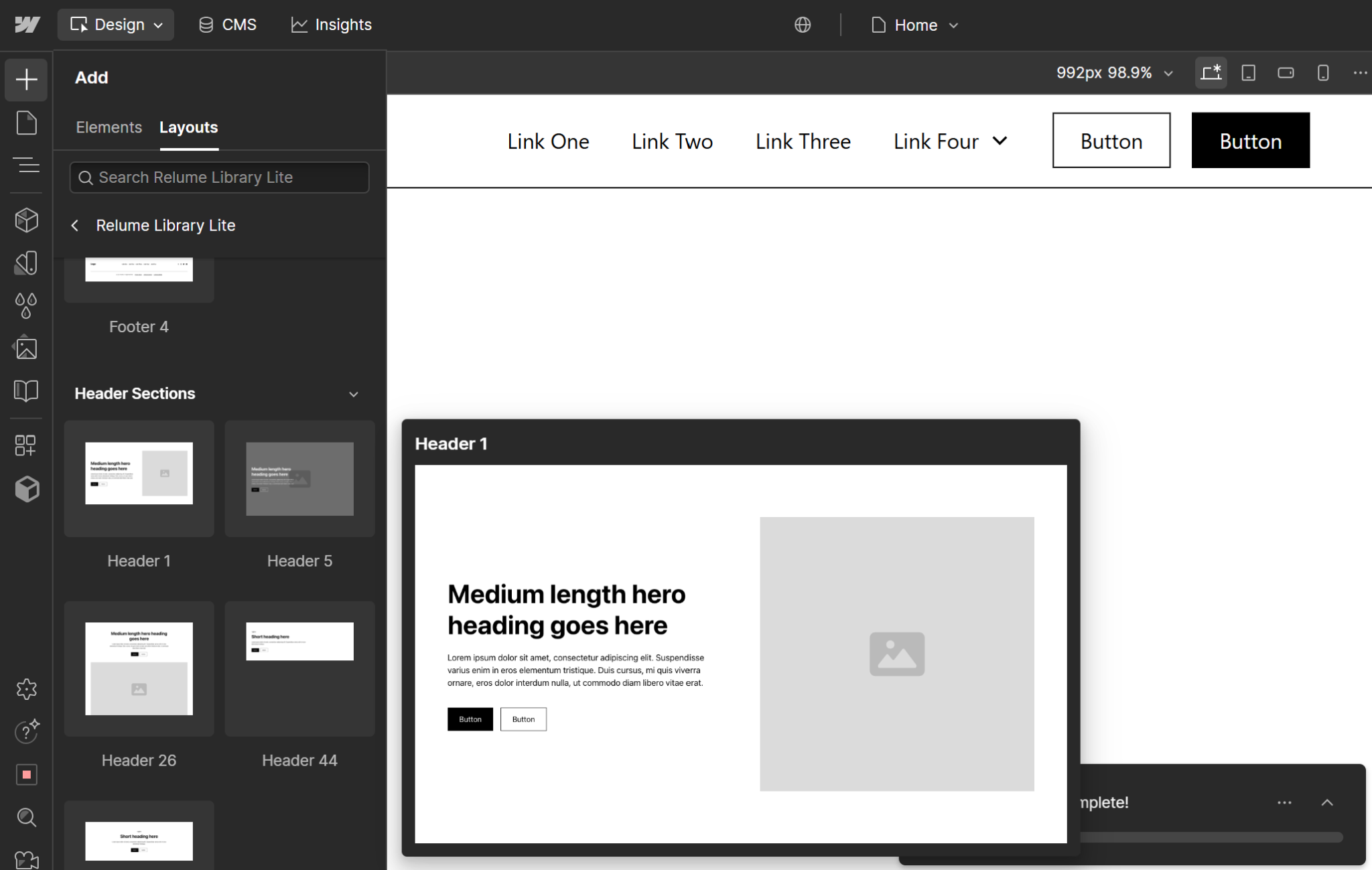 Dodawanie sekcji nagłówkowej w Webflow przy użyciu komponentu Header 1 z biblioteki Relume. To pierwszy widoczny element na stronie internetowej – miejsce, w którym możesz umieścić tytuł projektu i wezwanie do działania.