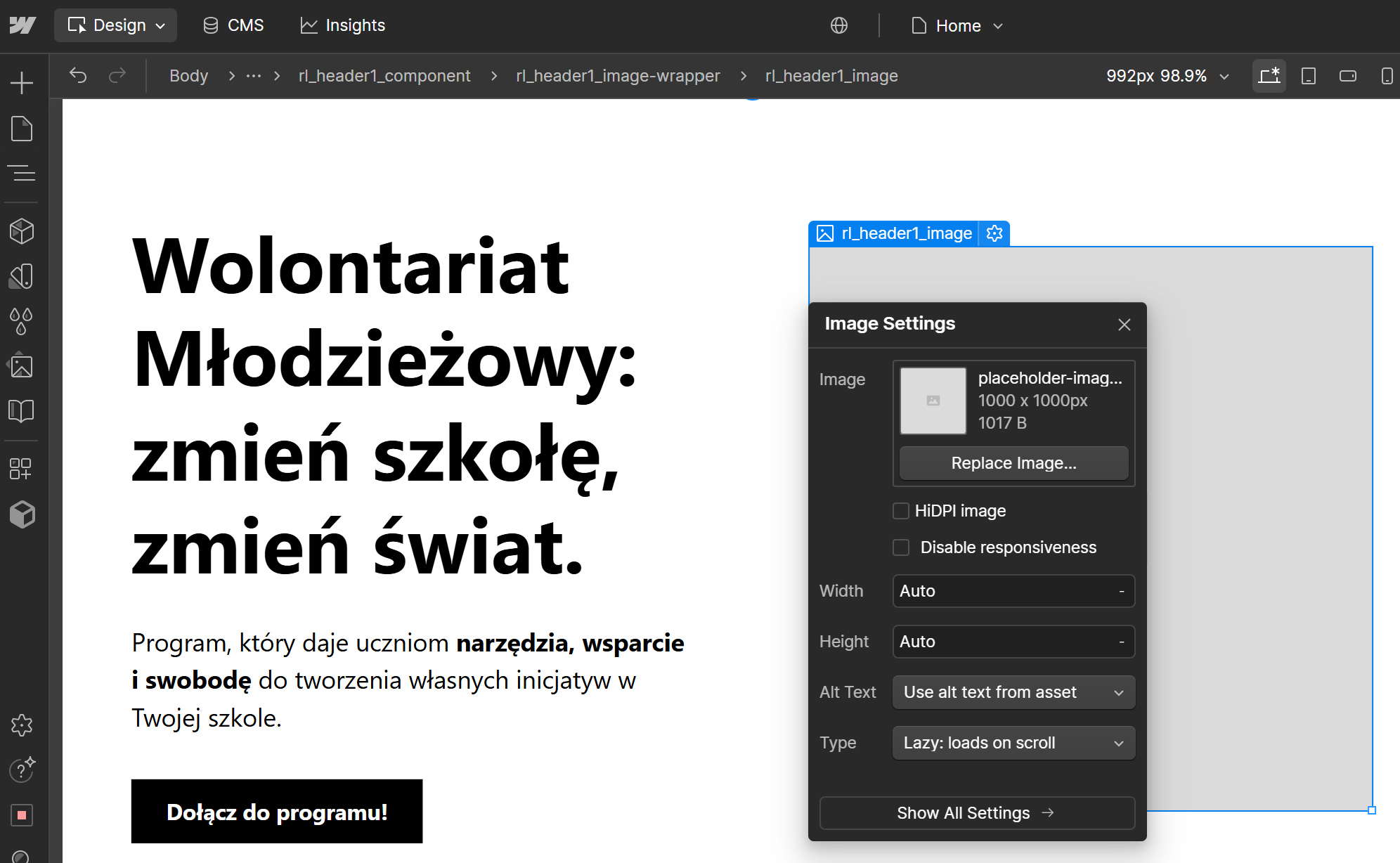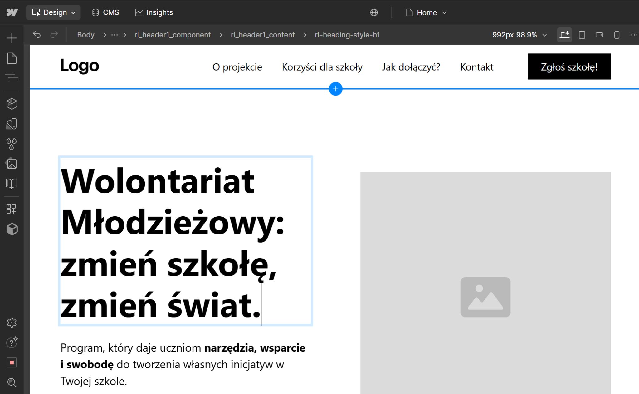 Edytowanie tekstu w nagłówku i sekcji programu „Wolontariat Młodzieżowy”. W Webflow możesz dowolnie zmieniać treści, kolory i styl elementów, co pozwala w pełni dostosować stronę internetową do potrzeb projektu i zachowań użytkowników.