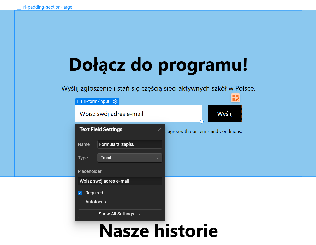 Kliknij pole formularza w sekcji „Dołącz do nas”. Wyświetli się niebieska ikona zębatki. Kliknij ją. W oknie edycji formularza możesz zmienić nazwę formularza (Name) i tekst pomocniczy, który wyświetla się w polu (Placeholder).