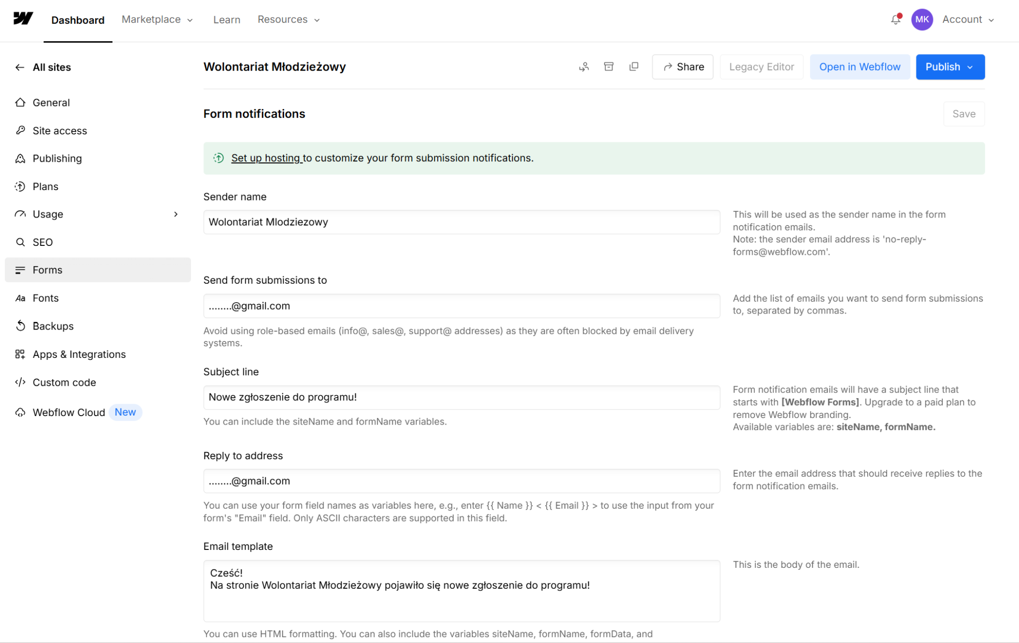 Zgłoszenia, które użytkownicy dodadzą za pośrednictwem formularza, będą wysyłane na wybrany przez ciebie adres e–mail. Możesz skonfigurować szczegóły wiadomości, którą otrzymasz od Webflow, kiedy w formularzu pojawi się nowe zgłoszenie:
