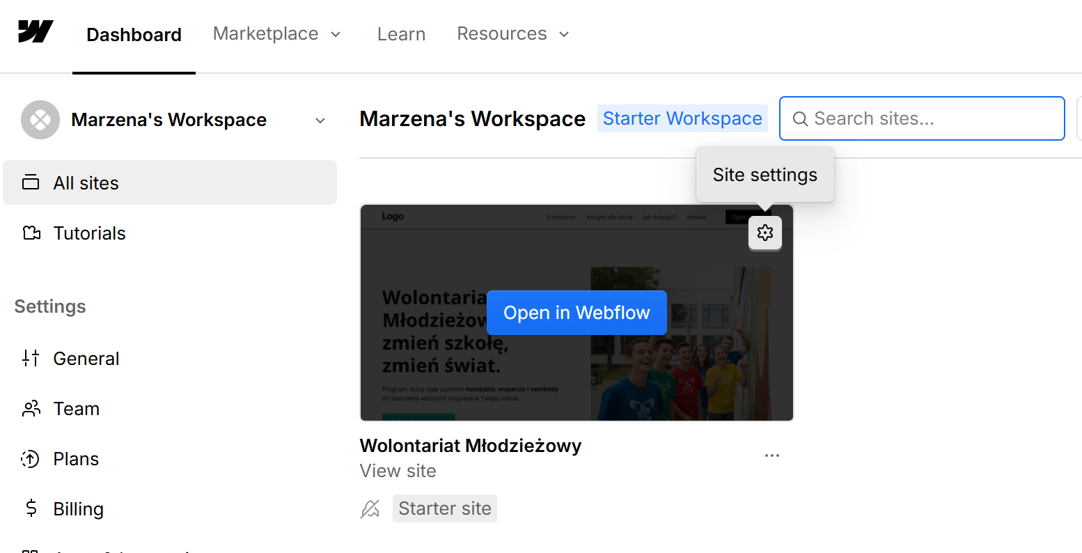 Jeśli zatem chcesz stworzyć prostą stronę startową (tzw. landing page) dla projektu i nie masz nic przeciwko, aby była ona opublikowana w domenie webflow.io (np. wolontariat-mlodziezowy.webflow.io), plan Starter będzie wystarczający.