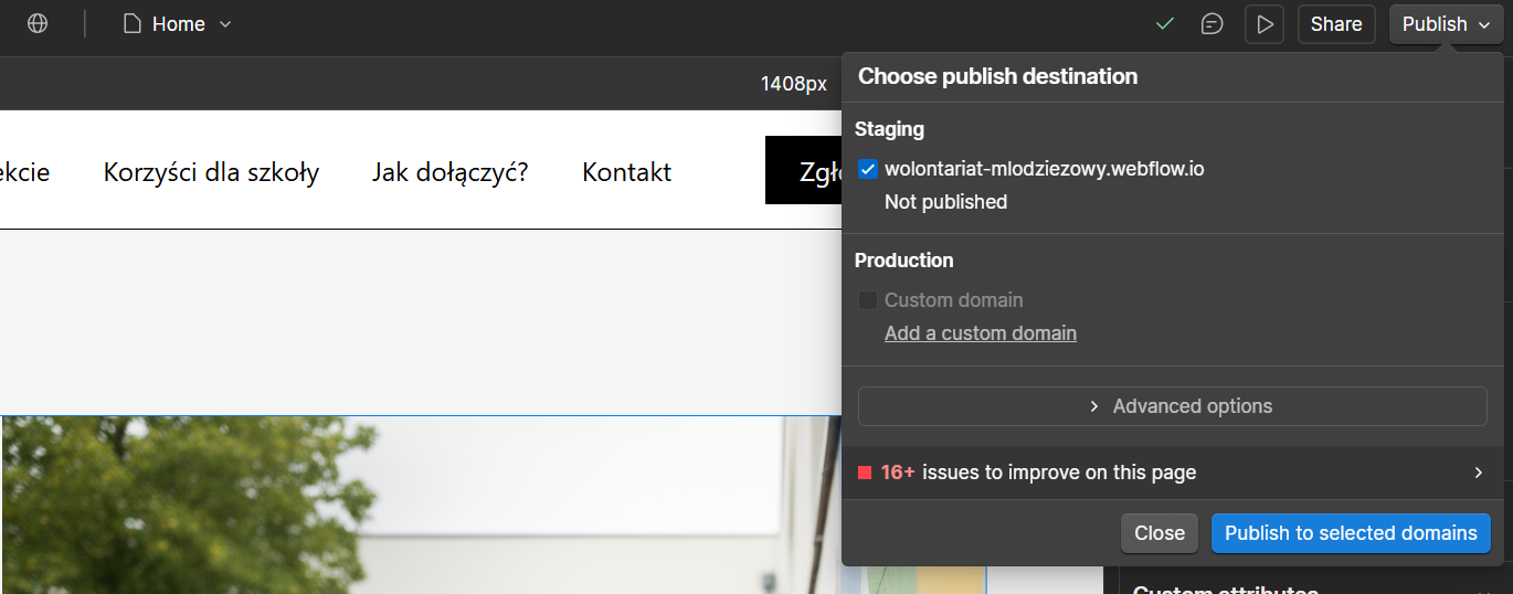 1. W wersji bezpłatnej Webflow nie pozwala na publikację strony pod własną domeną.