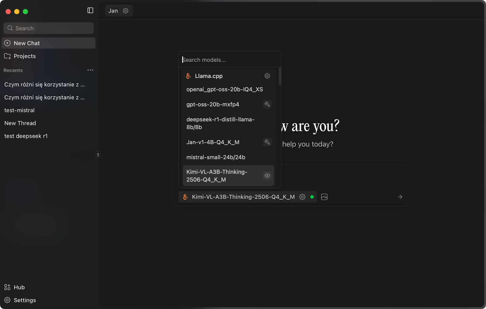 - Jan.ai, podobnie do LM Studio, to aplikacja z wbudowanym katalogiem modeli do pobrania i uruchamiania lokalnie.